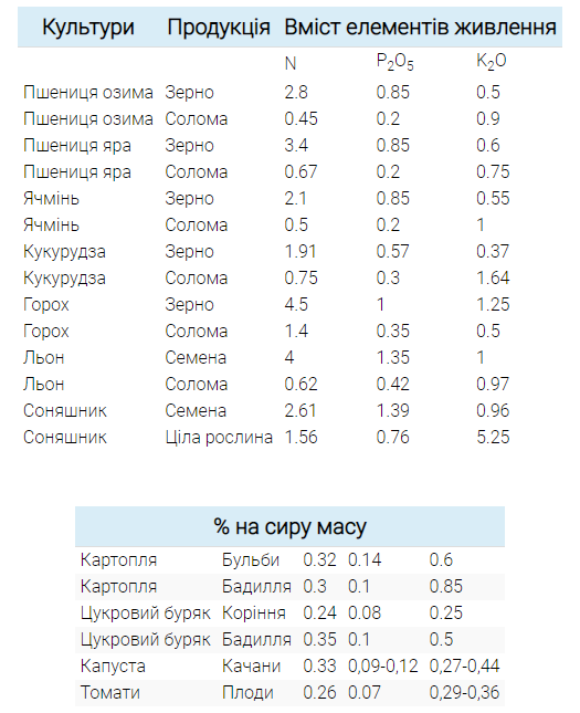 Относительное содержание элементов минерального питания в основной и побочной продукции различных сельскохозяйственных культур определяется, прежде всего, их видовыми особенностями, но зависит также от сорта и условий выращивания. Содержание азота и фосфора значительно выше в хозяйственно ценной части урожая — зерне, корне и клубнеплодов, чем в соломе и ботве. Калия же больше содержится в соломе и ботве, чем в товарной части урожая.